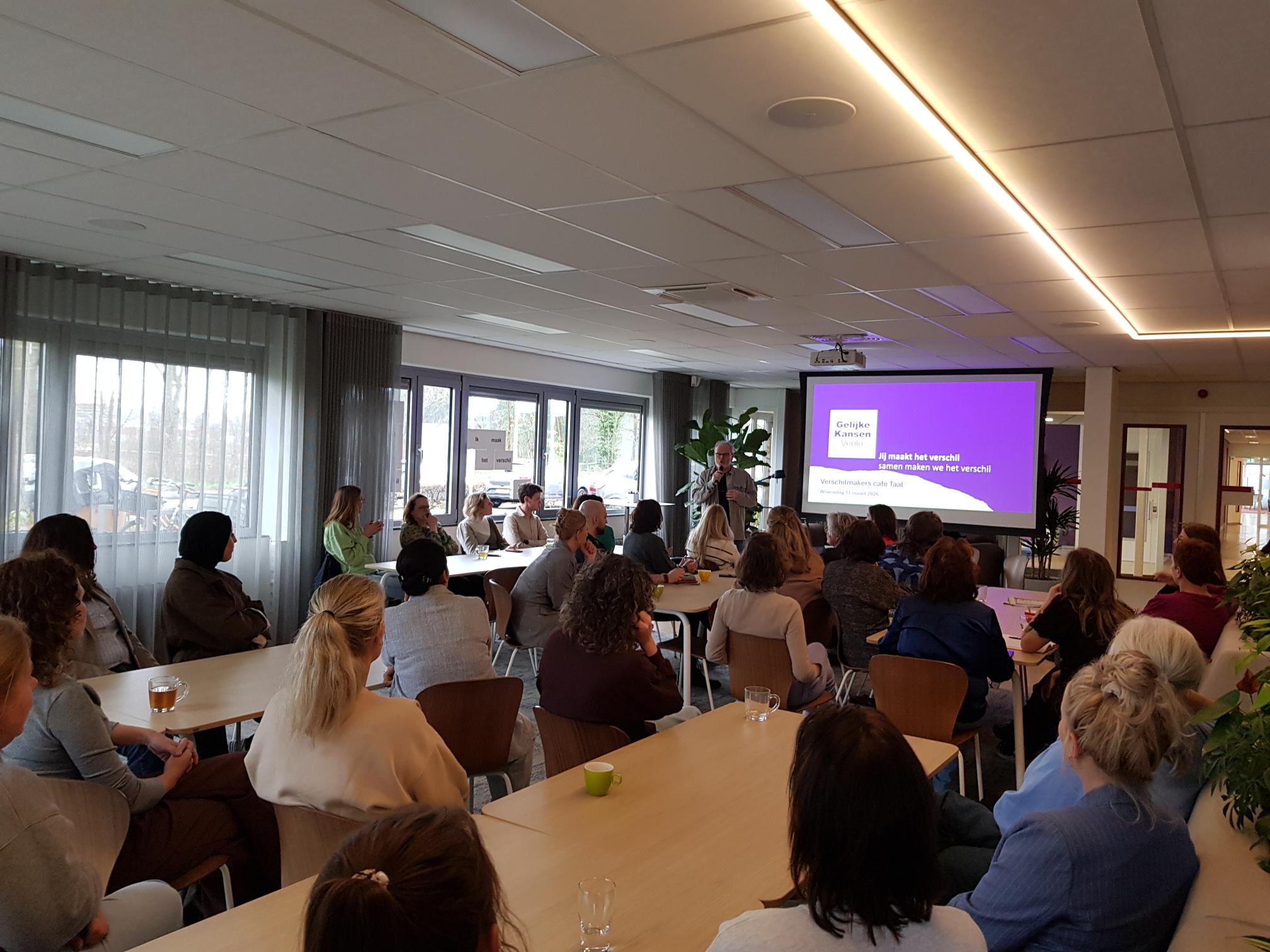 Op 11 maart vond het eerste verschilmakerscafé plaats met het thema Taal. Zo’n 30 gasten van het café luisterden eerst aandachtig naar de stamgasten, die hun goede praktijkvoorbeelden toelichtten. Geïnspireerd gingen de cafégasten daarna met elkaar in gesprek over “Hoe laat je in je dagelijks handelen zien dat je taal belangrijk vindt”. De muzikale ondersteuning en de nootjes op tafel maakte de informele sfeer compleet.